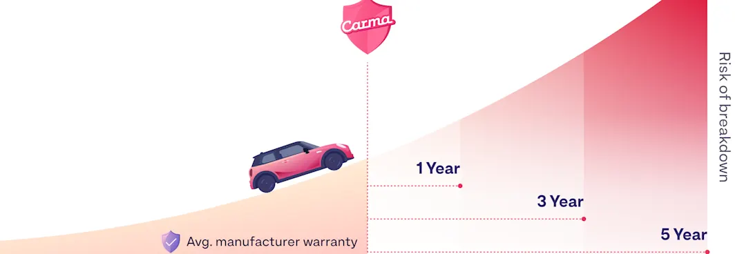 Your car’s risk of breakdown naturally increases over its lifetime. Typical manufacturer warranty lasts 3-5 years, however your car may become more susceptible to breakdown as it ages. Carma Extended Coverage helps protect your car during the most important part of its lifetime.